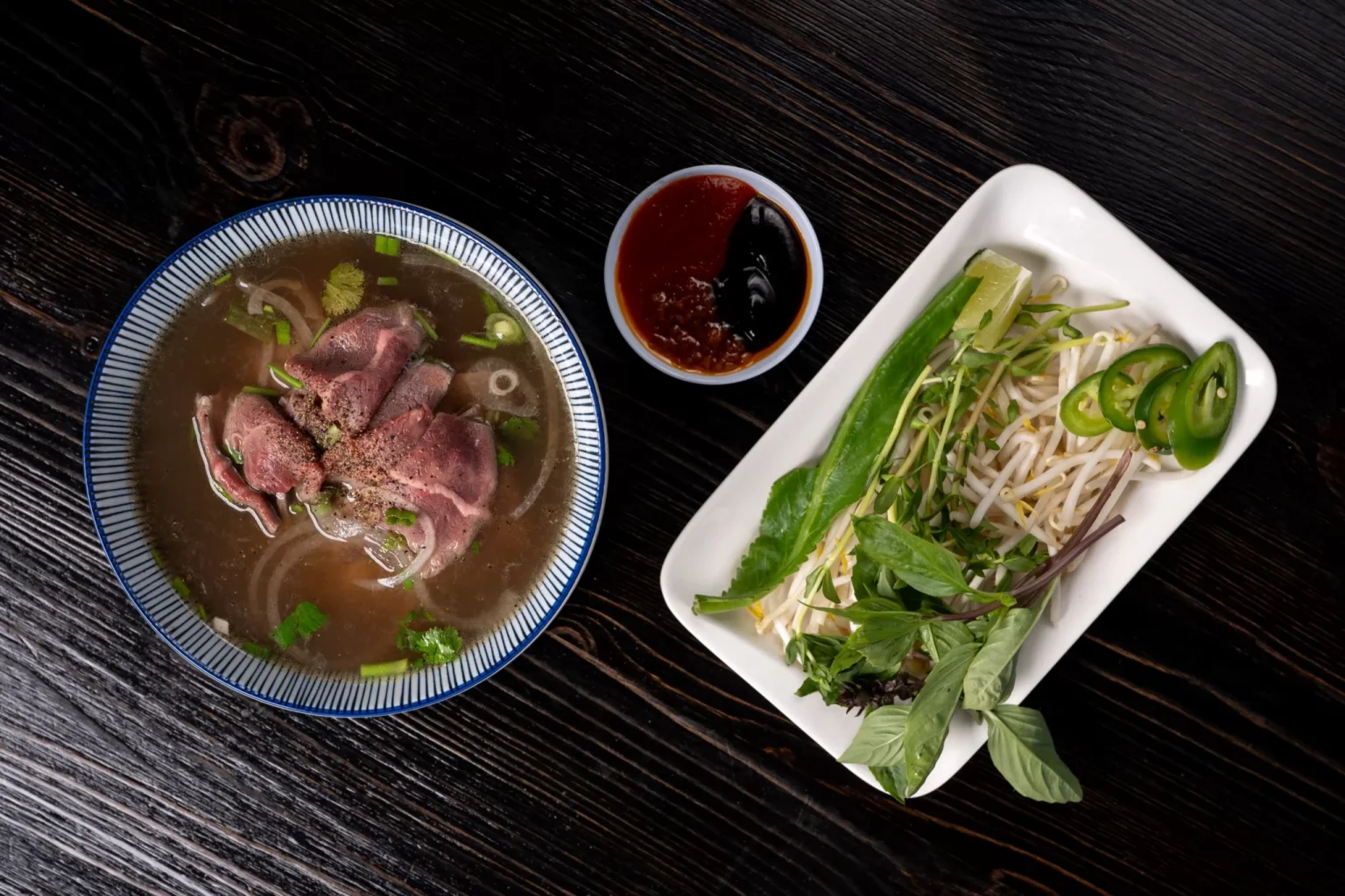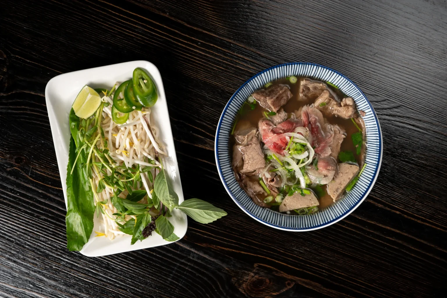 The result is a deeply comforting bowl topped with high-quality cuts like rare steak, tender rib cubes, brisket, and meatballs, served alongside fresh herbs, bean sprouts, and jalapeños.